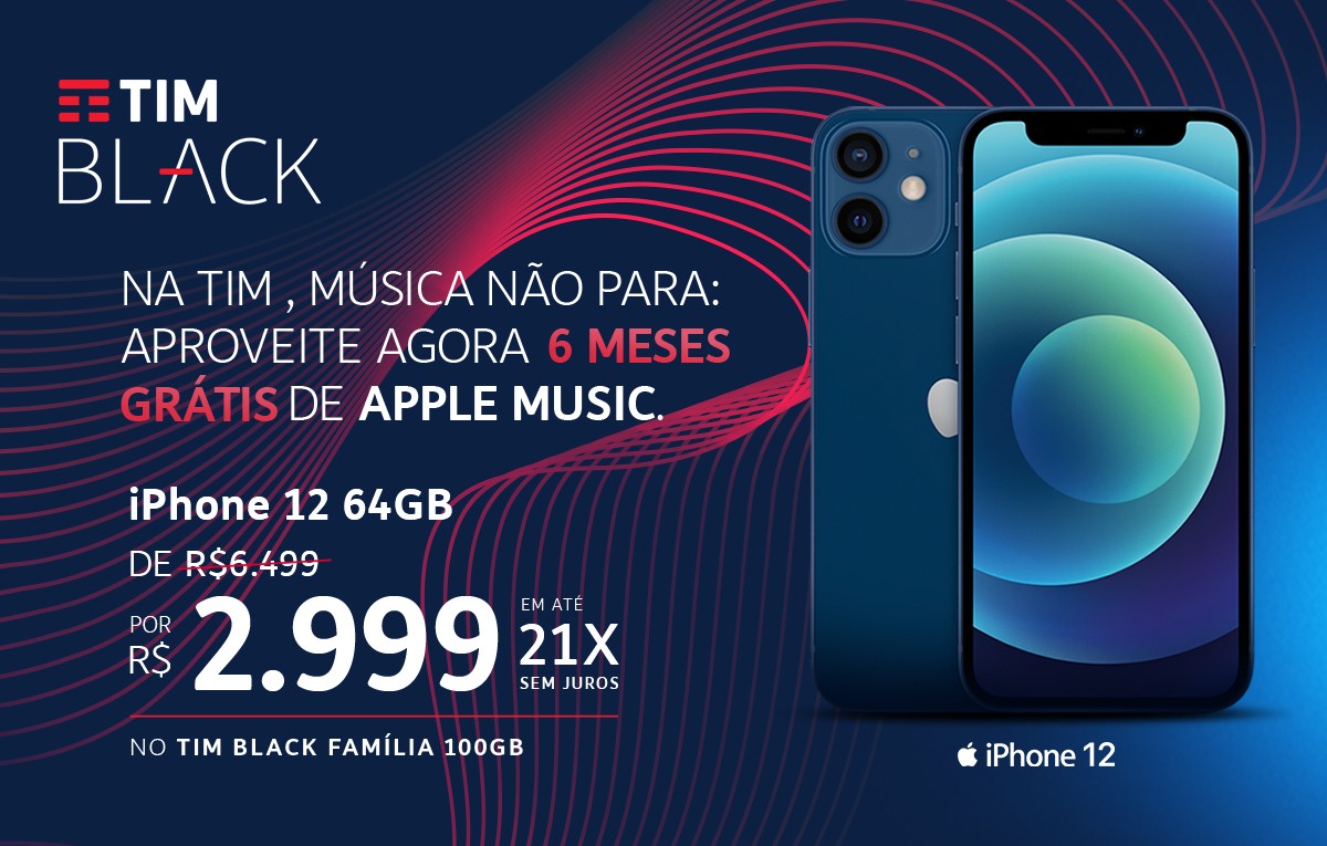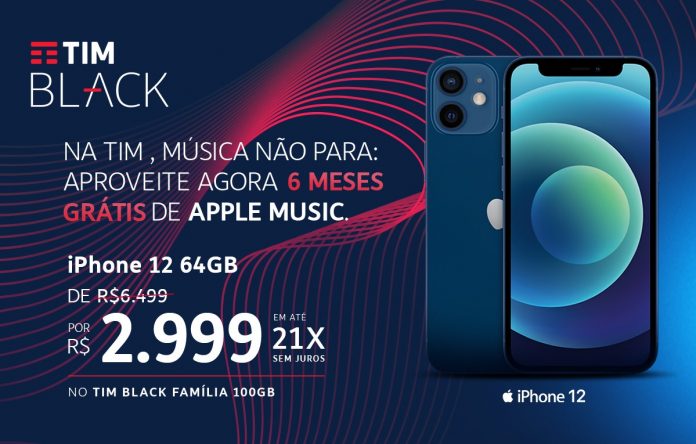 O iPhone 12 sai por R$ 2.999 para quem contratar o TIM Black Família com 100GB de internet.