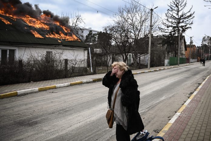 04/03 – Uma mulher reage em frente a uma casa em chamas bombardeada na cidade de Irpin, nos arredores de Kiev, nesta sexta (4). Mais de 1,2 milhão de pessoas fugiram da Ucrânia para países vizinhos desde que a Rússia lançou sua invasão em grande escala em 24 de fevereiro, segundo a ONU
