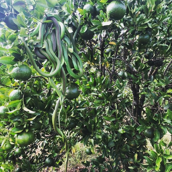 Você já viu um “cacho” de cobras? Telmo Santos viu. Ele registrou, no município de Santo Antônio da Patrulha (RS), um grupo de cobras-verdes penduradas sob os galhos de um pé de mexerica. A foto foi parar em um grupo no Facebook, depois em uma revista científica especializada em cobras e, finalmente, foi explicada. O fenômeno é chamado cientificamente de agregação reprodutiva. As fêmeas exalam hormônios sexuais e, eventualmente, muitos machos são atraídos ao mesmo tempo por uma fêmea só, o que faz com que eles se agreguem em volta dela, tentando copular. Tá explicado.