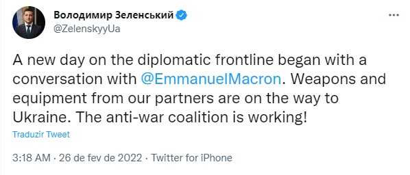 Em uma outra publicação, Zelensky disse que conversou com o presidente francês Emmanuel Macron. “Armas e equipamentos de nossos parceiros estão a caminho da Ucrânia. A coalizão anti-guerra está funcionando!”