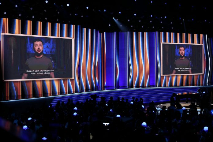 Volodymyr Zelensky, presidente da Ucrânia, participa por vídeo do Grammy 2022