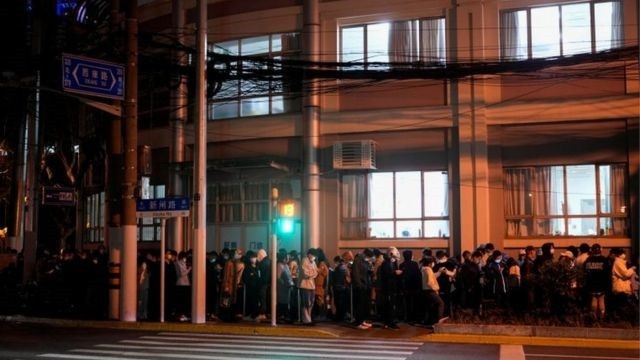 Quase todos os 25 milhões de moradores foram confinados devido ao surto de Covid mais grave na China em dois anos, e em condições muito rígidas que provocam o receio de alguns pais de se separar dos filhos. Residentes de Xangai fazem fila por um teste de Covid-19, em foto de 28 de março
