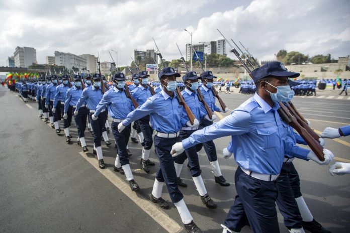 Ao menos 17 pessoas morreram, a maioria mulheres, segundo trabalhadores humanitários. Ataque aéreo na sexta matou 56 e feriu 30, incluindo crianças, em um campo para deslocados. Policiais exibem armas durante parada militar em Addis Abeba, capital da Etiópia, em 19 de junho de 2021, na véspera das eleições locais
