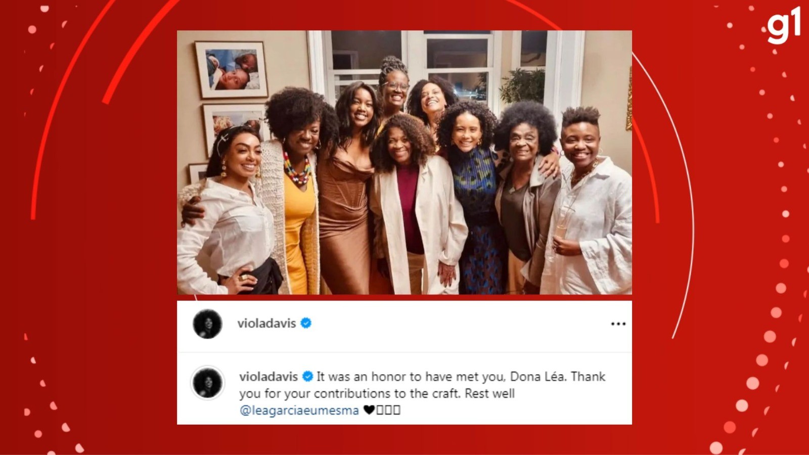 Léa morreu na terça-feira (15), vítima de um infarto, no hotel que estava hospedada na Serra do RS. No mesmo dia, a artista receberia uma homenagem com o Troféu Oscarito no Festival de Cinema de Gramado. Postagem de Viola Davis sobre Léa Garcia