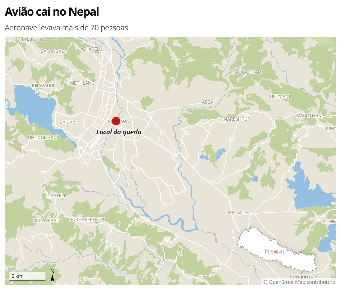 Aeronave operada pela Yeti Airlines decolou de Kathmandu, capital do país, neste domingo (15). Autoridade militar informa que, ao menos, 16 pessoas morreram. Um avião levando 72 pessoas a bordo caiu no oeste de Pokhara, no Nepal, neste domingo (15). A informação foi confirmada por uma autoridade do aeroporto, segundo a agência de notícias Reuters.