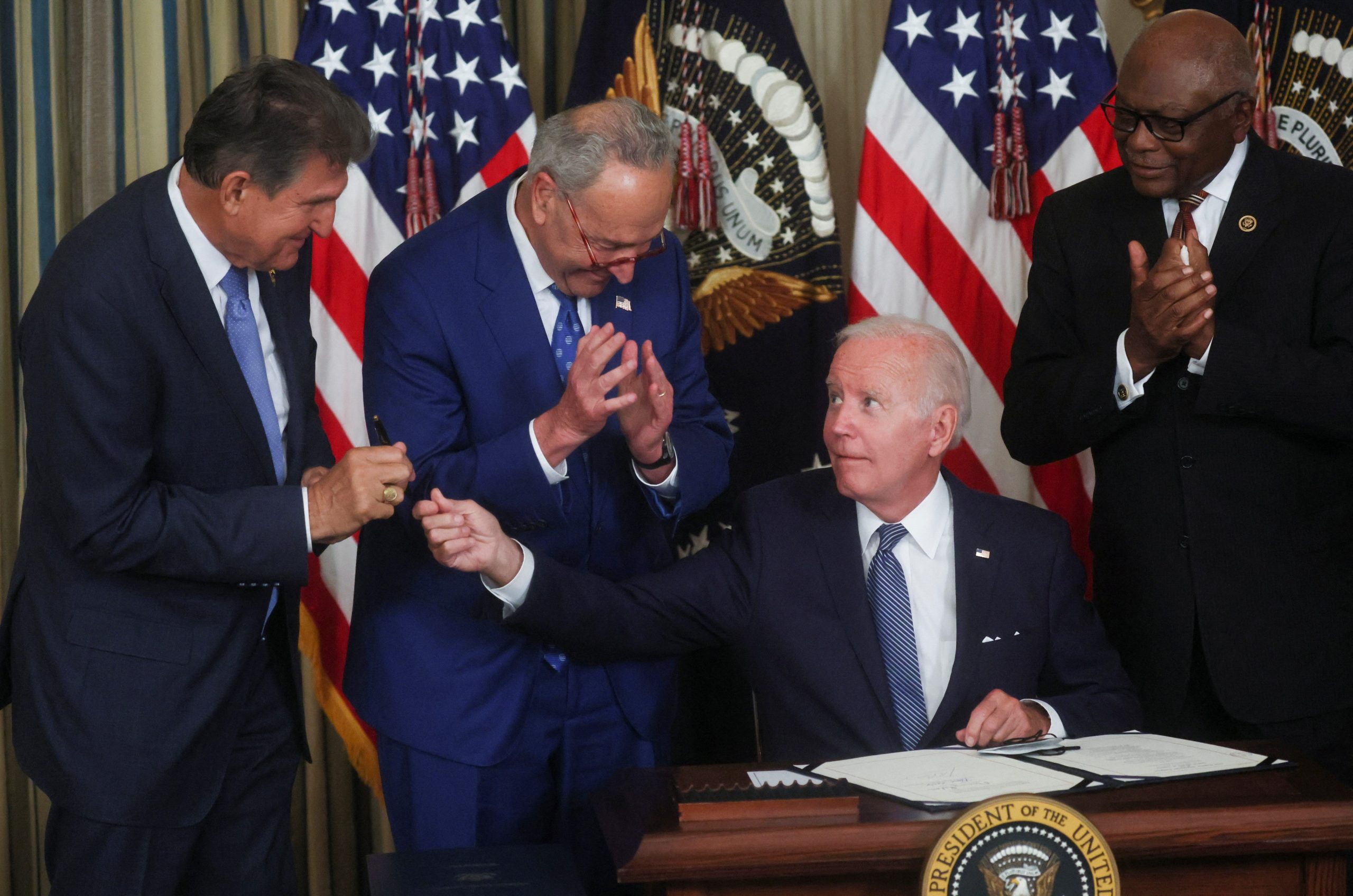 Pacote proposto pelo governo o é maior da história dos Estados Unidos para lidar com aquecimento global. O presidente dos EUA, Joe Biden, entrega sua caneta a Joe Manchin enquanto o líder da maioria no Senado Chuck Schumer e o líder da maioria na Câmara dos EUA, James Clyburn observam após o presidente assinar a lei de US$ 430 bilhões durante uma cerimônia na Casa Branca, em Washington, em 16 de agosto de 2022