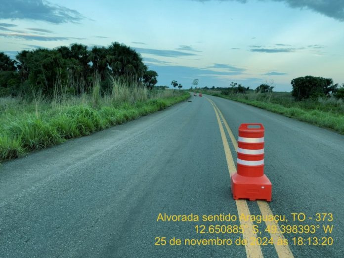 Rodovia TO-373 com sinalização para trânsito em meia pista