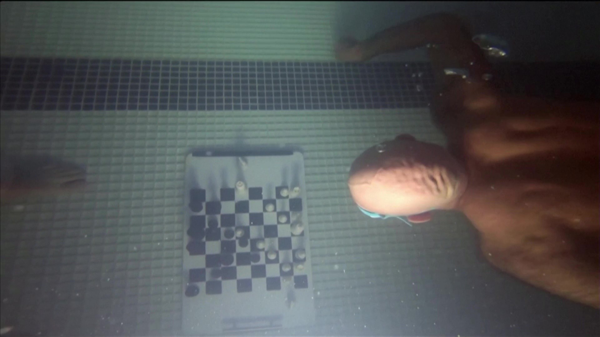 Com um tabuleiro no fundo de um piscina, os jogadores precisam prender o fôlego para mexer as peças de xadrez. Campeonato Mundial de Xadrez de Mergulho é disputado em Londres