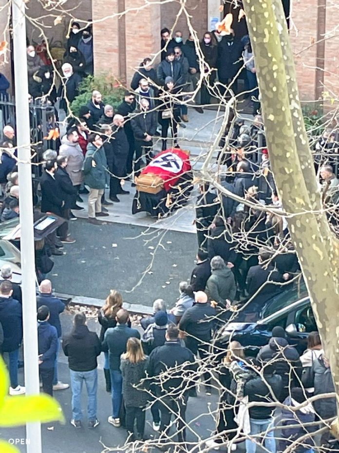 Líderes católicos e judeus italianos condenaram nesta terça-feira (11) um episódio em que extremistas de direita colocaram uma bandeira com uma suástica sobre um caixão do lado de fora de uma igreja após um funeral religioso e fizeram saudações nazistas.