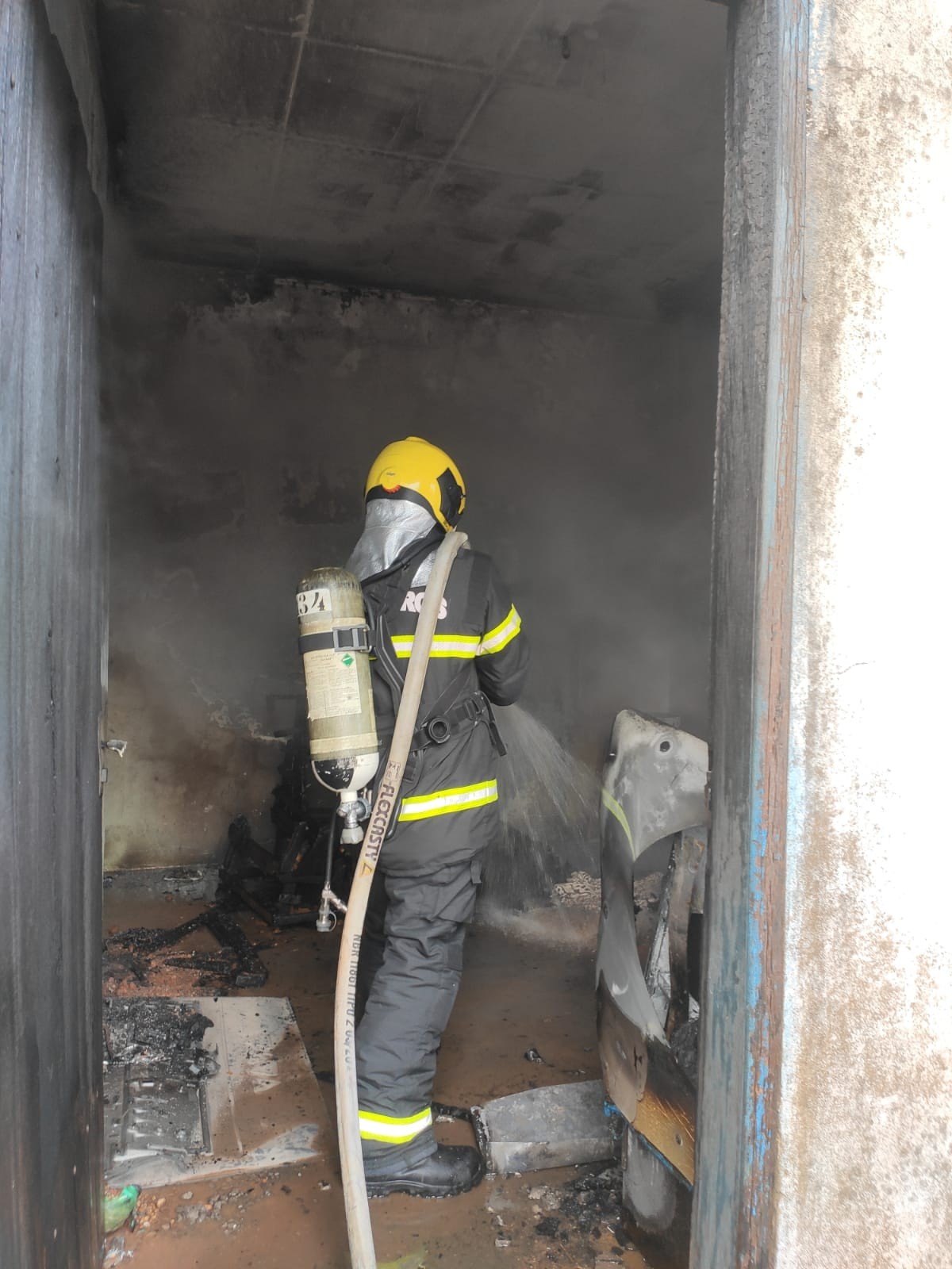O fogo chegou a destruir todos os móveis da sala da casa, como a TV, um jogo de sofá e até a porta da casa. Um freezer também foi atingido pelas chamas.