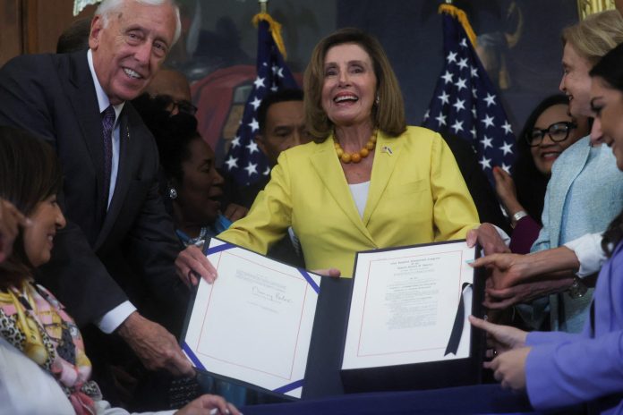 Pacote proposto por governo de Biden é maior da história dos Estados Unidos para lidar com aquecimento global. O líder da maioria na Câmara, Steny Hoyer, a presidente da Câmara, Nancy Pelosi, e a deputada Carolyn Maloney seguram uma cópia assinada da “Lei de Redução da Inflação de 2022”, em uma cerimônia após o projeto de lei ser aprovado na Câmara nos EUA