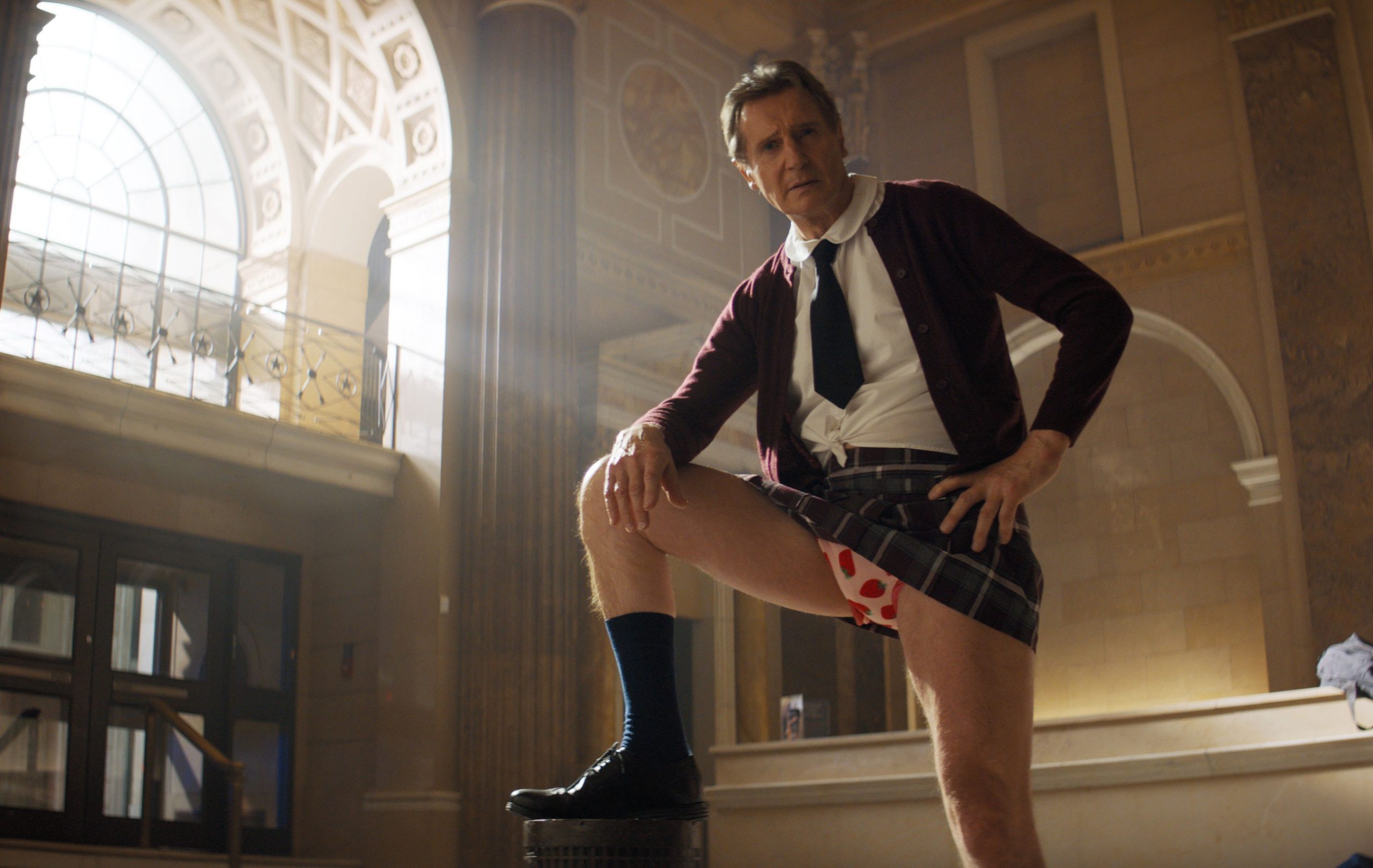 Aos 73 anos, dá para dizer que o irlandês – renomado por “A lista de Schindler” (1993) e reinventado como astro de ação em “Busca implacável” (2008) – mostra um novo conjunto de habilidades específicas como comediante do estilo.