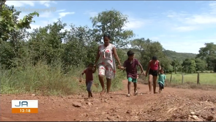 Sem infraestrutura a kombi escolar não consegue chegar até o assentamento e as crianças precisam andar até dois quilômetros para chegar até o local onde o veículo passa. A Rita de Cássia conta que faz o trajeto quatro vezes por dia com os filhos.