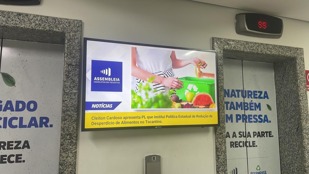 Os monitores vão servir para veiculação de imagens do plenário ao vivo, indicadores econômicos, ações institucionais e notícias do tempo, entre outras mensagens. Registro feito em um dos monitores mostra um card com o título de material produzido pela assessoria da própria Assembleia.