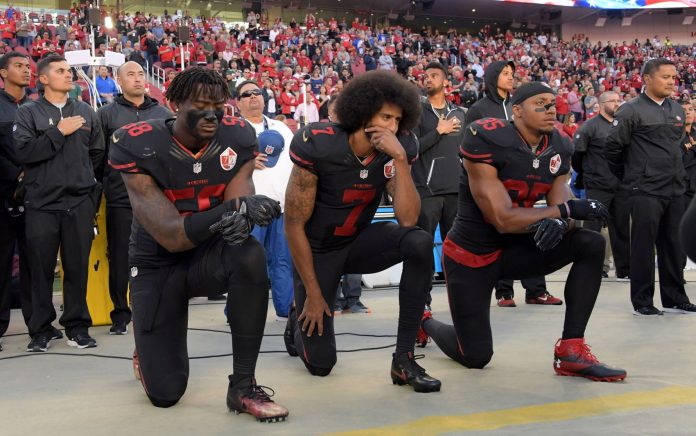 Colin Kaepernick (centro), então quaterback do San Francisco 49ers, começou seu protesto durante a pré-temporada de futebol americano de 2016