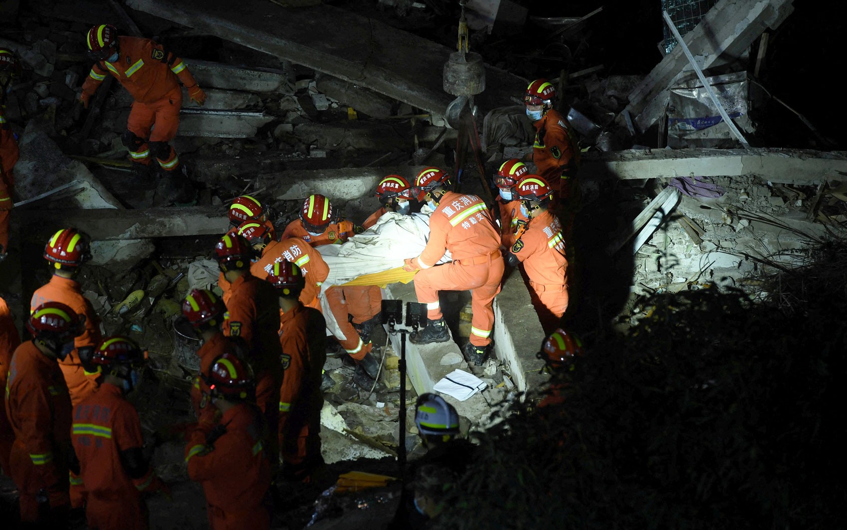 Suspeita é de que local que abrigava cantina tenha tido vazamento de gás, segundo emissora estatal CCTV. Até a meia-noite de sexta-feira, já haviam sido retiradas 26 pessoas, das quais 16 morreram e uma estava em estado crítico. Bombeiros realizam resgate em local onde prédio desabou após explosão em Congqing, na China, na noite de sexta-feira (7)