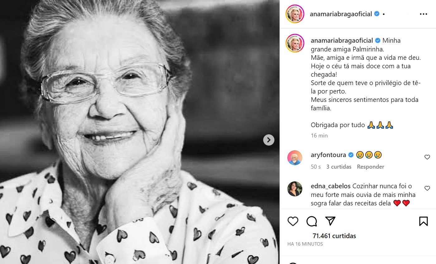 A apresentadora Ana Maria Braga lamentou a morte de Palmirinha nas redes sociais. Vovó Palmirinha, como era conhecida, faleceu neste domingo (7), aos 91 anos. Segundo os familiares, ela teve um agravamento de problemas renais crônicos.