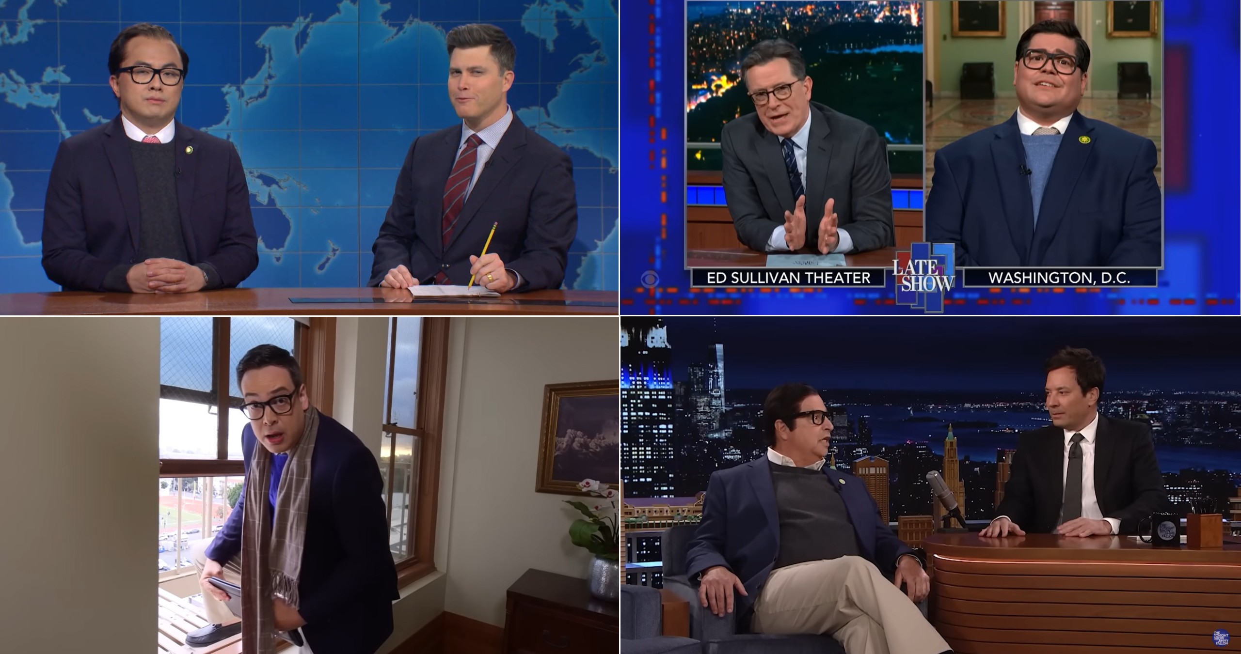 Foram tantos imitadores de George Santos nos talk shows que até isso virou piada. Stephen Colbert fez uma montagem com todos os humoristas que encarnaram o deputado e criou o “Santos-Verso” (piada com o filme com o Homem-Aranha multiplicado de 2018).
