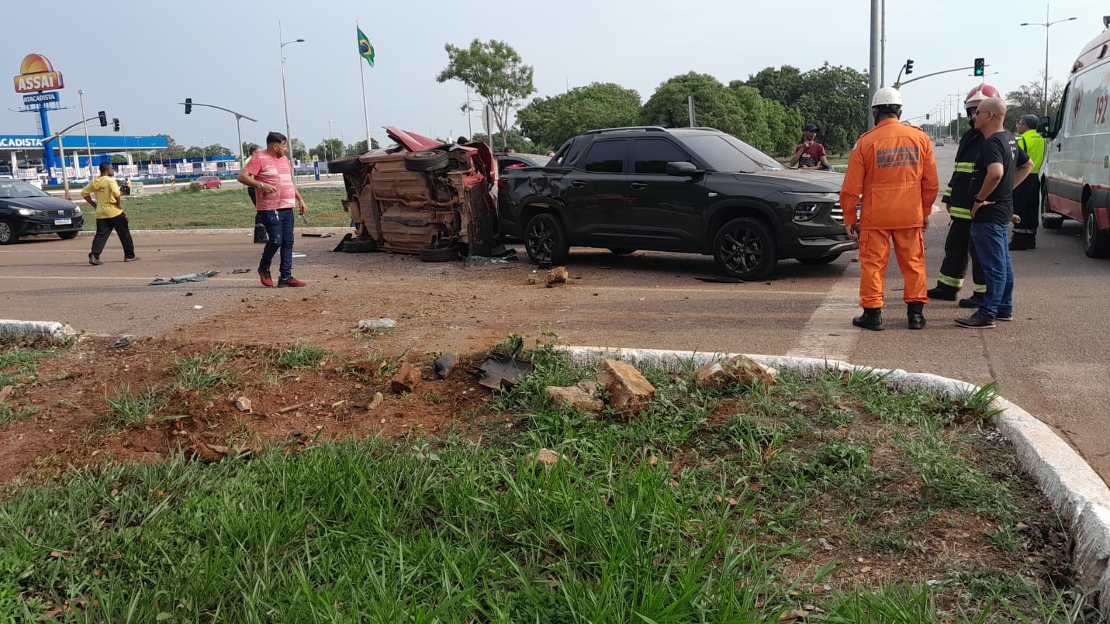 Acidente aconteceu na Avenida Teotônio Segurado, na região sul de Palmas. Bombeiros tiveram que retirar partes do carro para retirar vítima do carro. Motorista perde o controle e atinge quatro veículos em cruzamento de Palmas