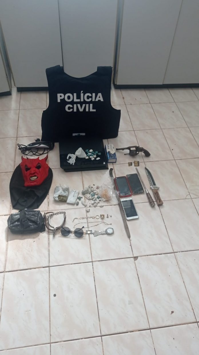 Durante o cumprimento do mandado, foram apreendidas mais de 90 pedras de crack; aproximadamente 40 porções de maconha, grande quantidade de maconha prensada que era mantida enterrada nos fundos da residência, um revólver calibre 32, munições de calibres diversos e outros objetos.
