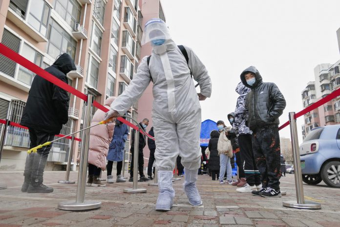 Profissional com roupa de proteção pulveriza desinfetante em uma fila para testes de Covid-19 em massa na cidade de Tianjin, no norte da China, em 9 de janeiro de 2022