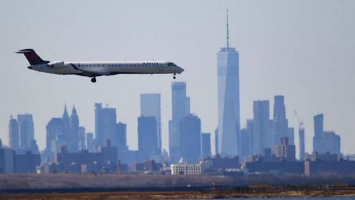 Dois aviões quase colidiram no Aeroporto Internacional John F. Kennedy. As autoridades estão investigando. Avião da Delta pousando em Nova York