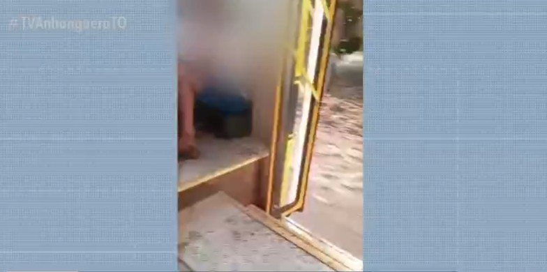 Ônibus circulando com a porta aberta em cidade do Tocantins