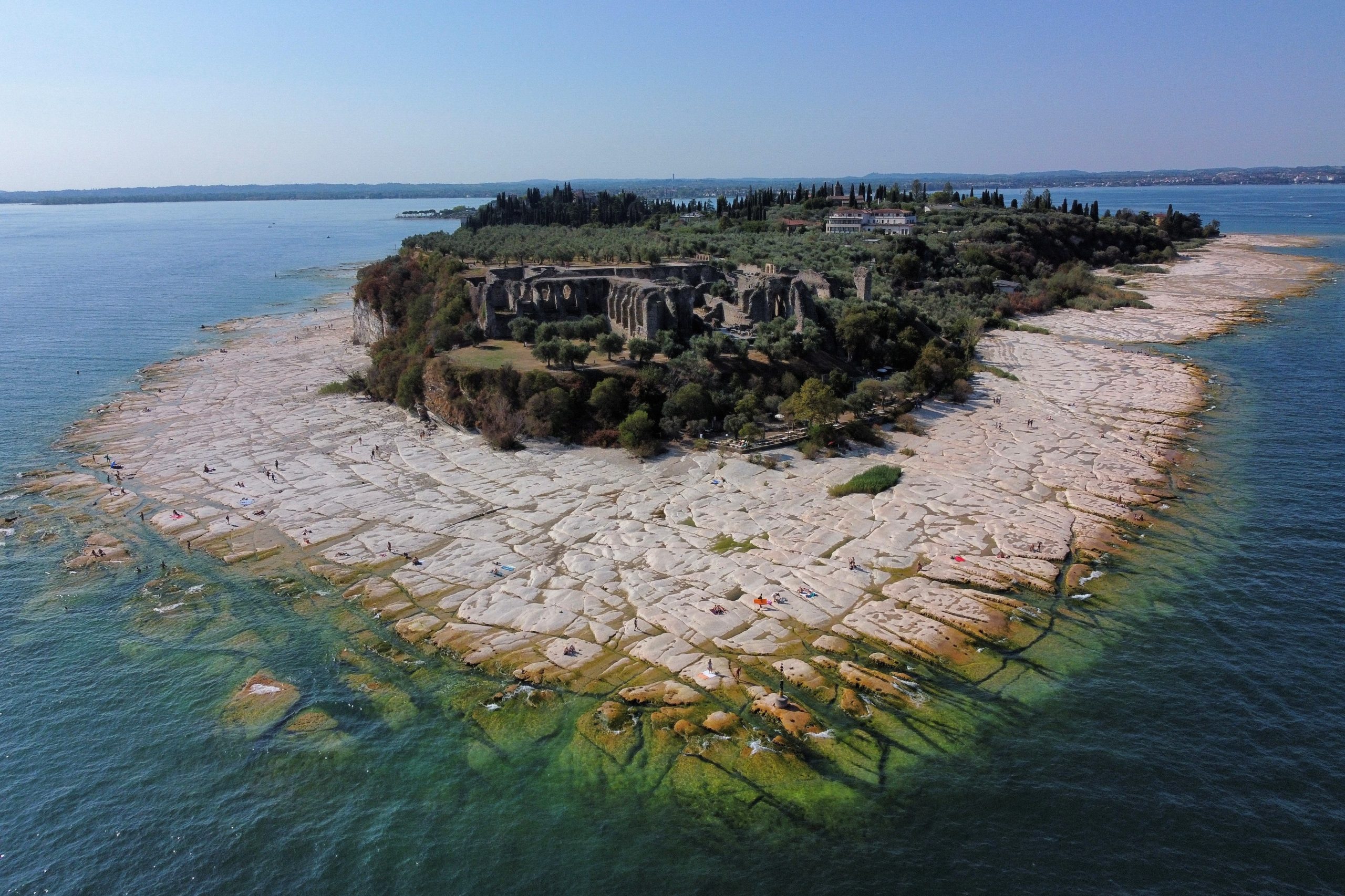 Leito rochoso do lago Garda aparece com a seca e forma uma praia em Sirmione, na Itália