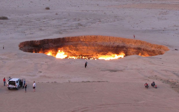 Chamado “Porta do inferno”, o local é um tradicional destino turístico com 70 metros de diâmetros e chamas que se veem de longe na paisagem desértica.