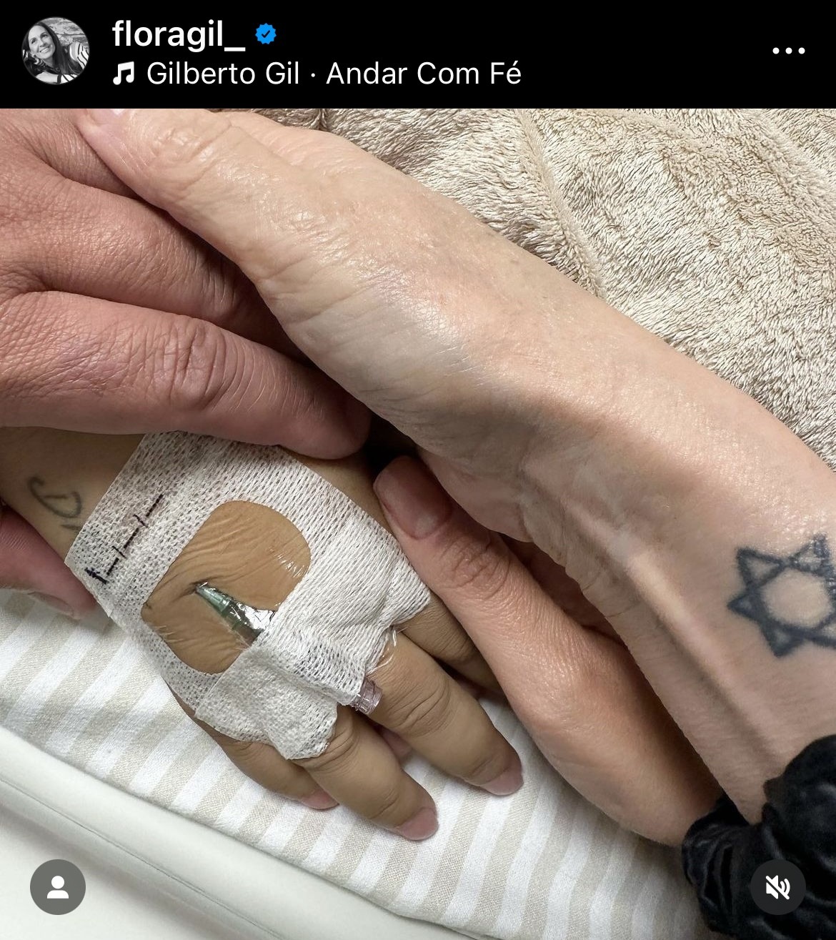 “Estou indo agora fazer a cirurgia pra retirar o tumor. Estou aqui cercada de amor, com meu filho Francisco Gil, ao meu lado e tantos amigos e familiares, estou grata e calma, muito confiante nos médicos, já Deus certo, receberei a energia e vibrações positivas de vocês, orem por mim”.