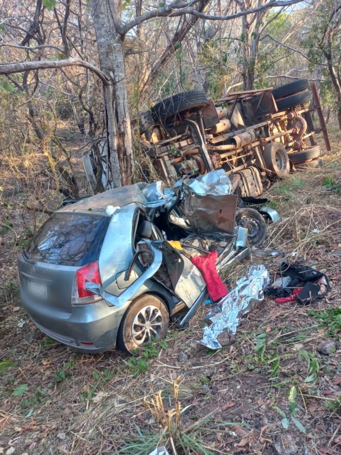 De acordo com o registro da Polícia Militar, os veículos seguiam em sentido contrário e bateram de frente. O caminhão ainda tombou às margens da rodovia e o carro de passeio ficou destruído.