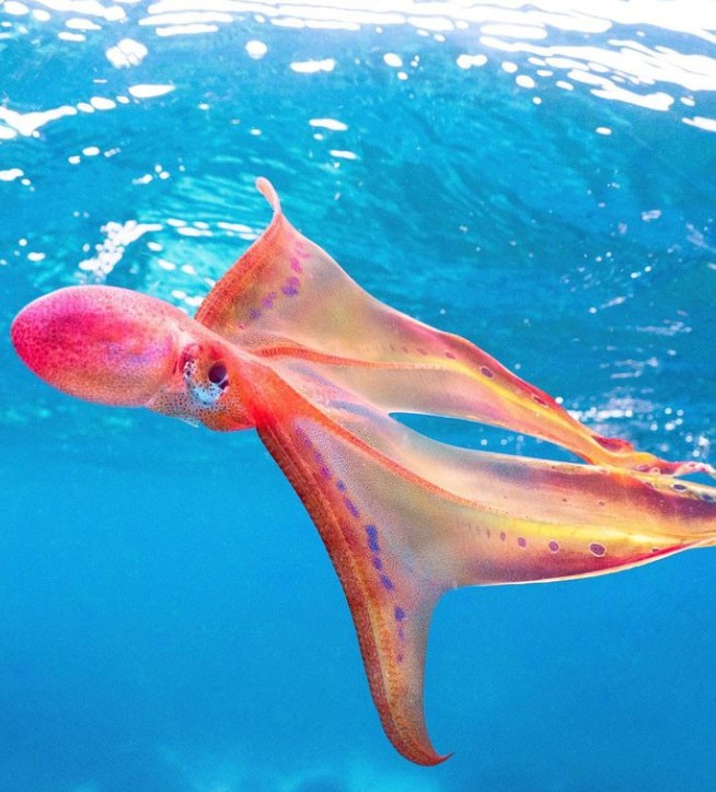 Esta foi apenas a quarta vez que um animal da espécie foi avistado no local até hoje. Fêmea pode medir até 2 metros e tem cauda que se assemelha a um véu flutuante colorido, enquanto macho chega a apenas 2,4 cm. Raríssimo polvo-véu é visto em Grande Barreira de Corais