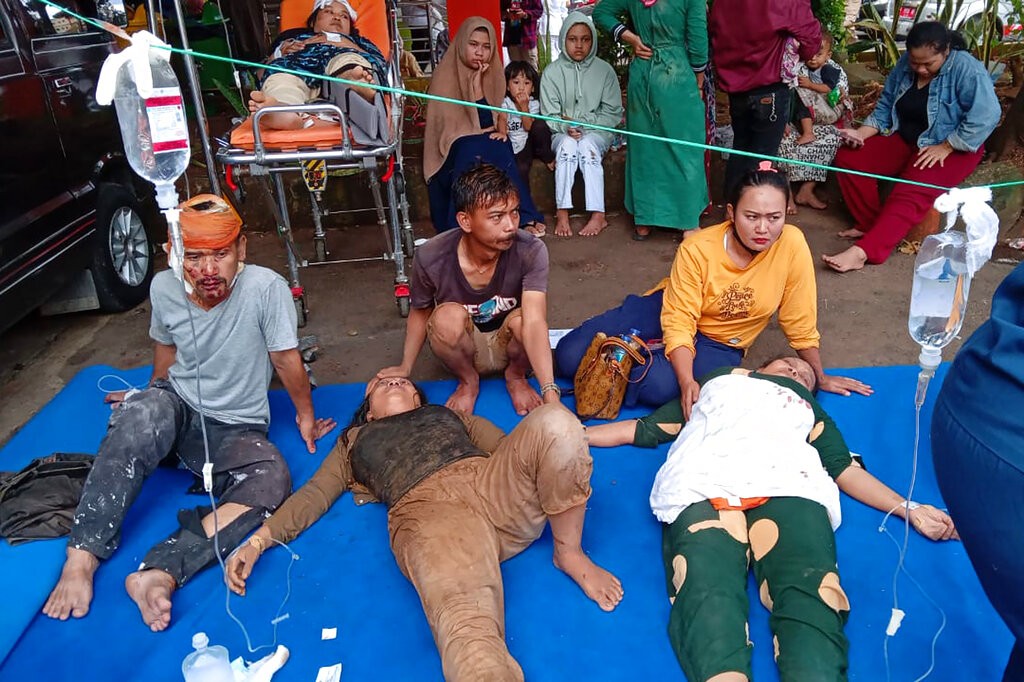 Tremor, de magnitude 5,6, teve epicentro em Java, a principal ilha do país, mas também foi sentido na região metropolitana da capital, Jacarta, que tem centenas de prédios. Feridos durante o terremoto são atendidos em Cianjur, em Java, na Indonésia, em 21 de novembro de 2022.