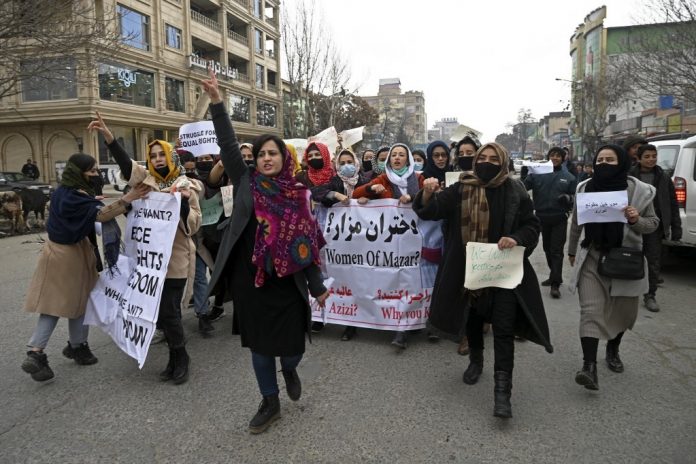 Cerca de 20 mulheres se reuniram na frente da Universidade de Cabul, gritando “Igualdade e justiça!”. Nas mãos, levavam cartazes que diziam “Direitos das mulheres, direitos humanos”.
