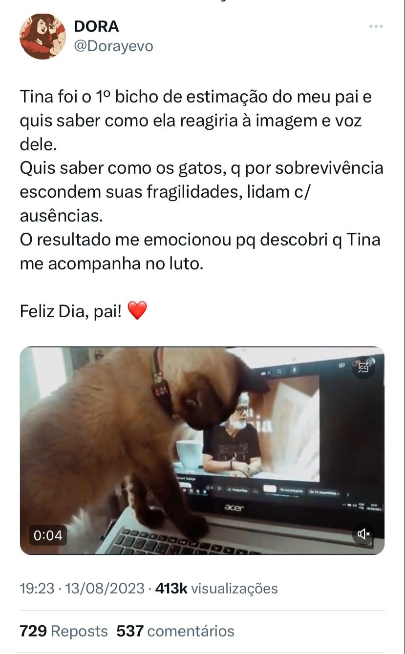 “Tina foi o primeiro bicho de estimação do meu pai e quis saber como ela reagiria à imagem e a voz dele. Quis saber como os gatos que, por sobrevivência, escondem suas fragilidades, lidam com as ausências. O resultado me emocionou, descobri que Tina me acompanha no luto”, postou Isadora.