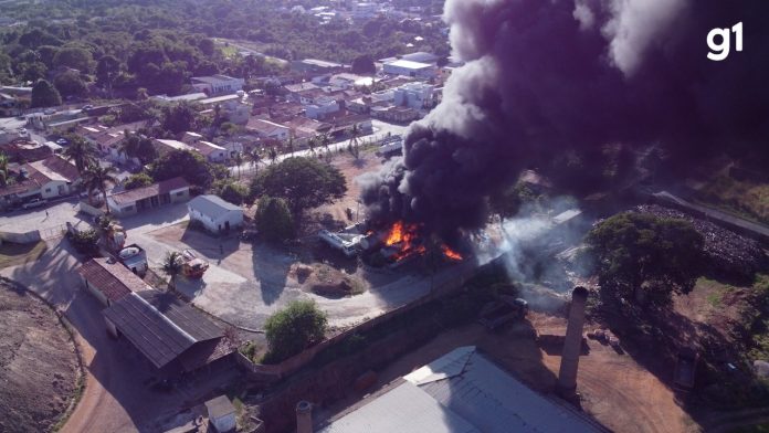 Grande nuvem de fumaça se espalha pela cidade de Dianópolis, no sudeste do Tocantins. Corpo de Bombeiros está no local para combater as chamas. Fogo atinge depósito de disel em Dianópolis