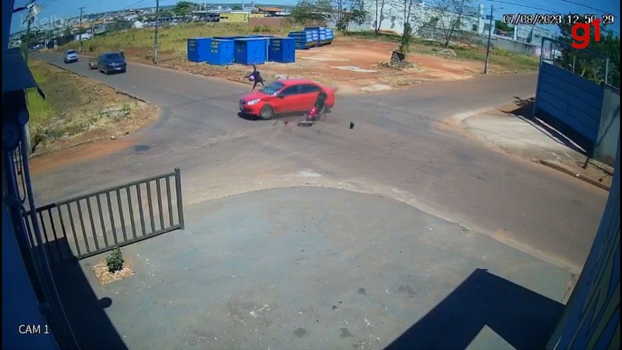 Uma câmera de segurança registrou o momento em que um motociclista foi arremessado e acaba dando um salto mortal no ar após atingir um carro. O acidente aconteceu em um cruzamento no setor Pedro Borges em Araguaína, no norte do Tocantins.