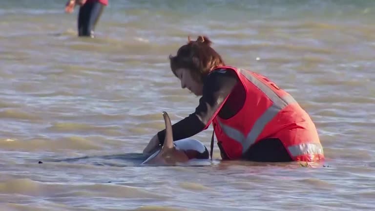 Voluntários na Nova Zelândia salvaram sete dos nove golfinhos encalhados nesta sexta-feira (12), carregando baldes de água e envolvendo os animais em toalhas para mantê-los hidratados até que a maré em uma praia remota subisse o suficiente para levá-los de volta ao mar.