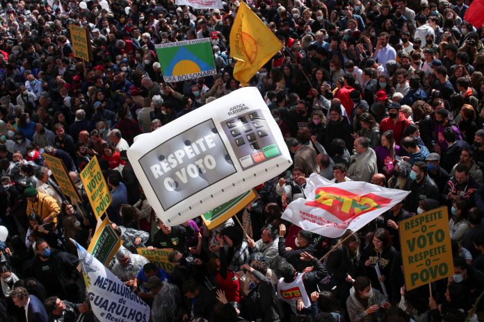 Pessoas exibem um balão em forma de urna eletrônica com as palavras ‘Respeite o voto’, durante evento o ato pela democracia em frente à sede da Faculdade de Direito da Universidade de São Paulo, no centro de São Paulo, nesta quinta (11)
