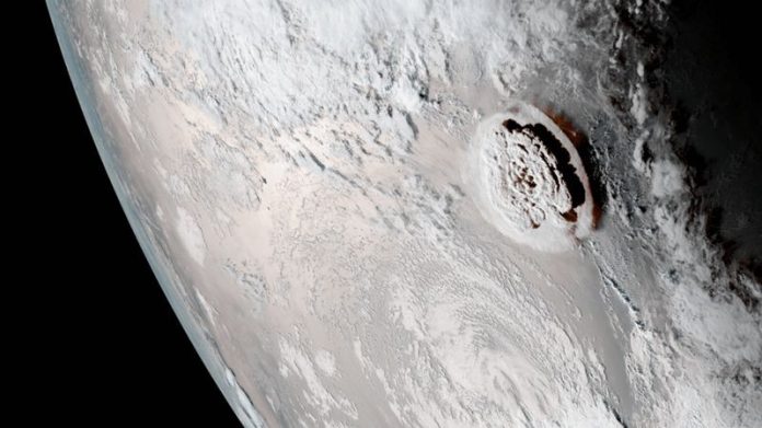 Uma onda de choque atmosférica foi detectada em todo o mundo e uma enorme nuvem de cinzas cobriu as ilhas do Pacífico por milhares de quilômetros. A erupção do vulcão vista de um satélite